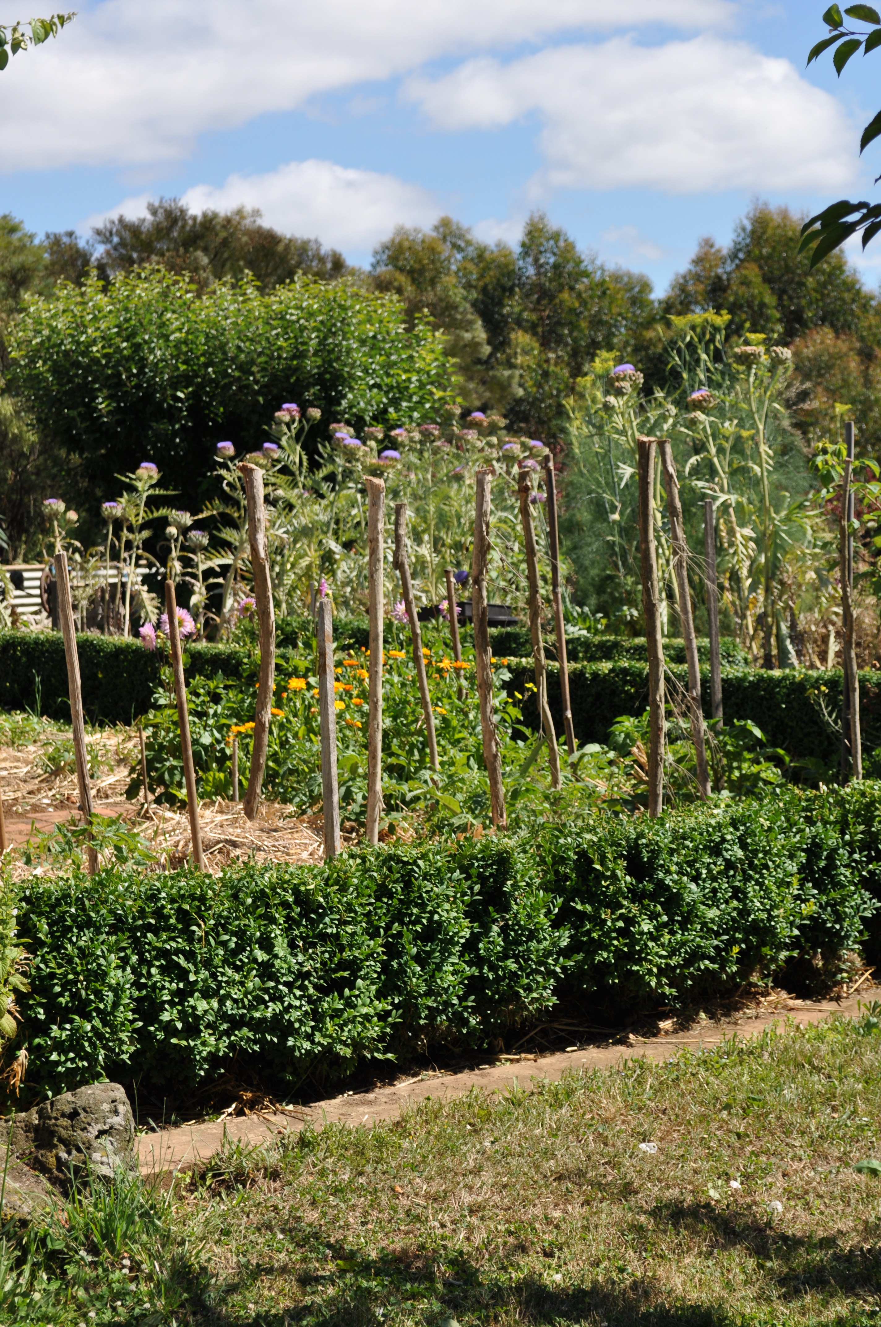 Probably, from the above photograph, you have worked out where I stand. My vegetable garden at Clear Springs is defined by these rustling lines of deep green. Box although haling from the Old World are as tough as any native in my garden and will forgive me when I don’t get around to clipping them. I can hack back inches and still they reveal glossy green foliage that look like I had planned it this way all along. It looks great all year round and is happy to take the supporting role to the more spectacular floral offerings, like the dahlias, calendula and artichokes that you can see in the photograph.