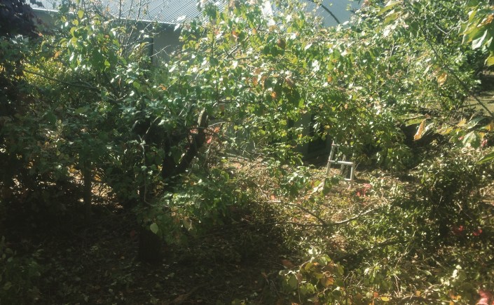 From the picture you can see it was a classic autumn day. The clippings went to the cows, who love fruit tree leaves (as well as fruit, apples in particular). The lopped branches will end up in a piece of rustic fencing at ‘Clear Springs’.