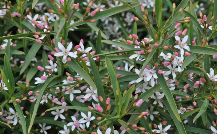 For if there were any colour that could represent this season, at least in my garden, it would have to be yellow. The first daffodils, the other early flowering wattles, some of the Kniphofias, even the Aeoniums, all send out striking yellow flowers at this time. Less stridently, but still apparent in late July and throughout August, there are primroses and phebalium and bulbinella, all cheerfully proclaiming the season. I lost my primroses during a few hot years when I didn’t water the ornamental garden. I lament their loss, but don’t pine for them. Phebalium squamulosum, the forest phebalium (not much of a common name, I’m afraid), on the other hand, a small shrub native to south eastern Australia, has proven to be much longer lived in comparison. Tucked in amongst Mahonia, Phormiums and Plectranthus, it holds its own against theses bigger brutes; its bronzy foliage waiting quietly for its moment of sunshine: stars bursting from brown buds.
